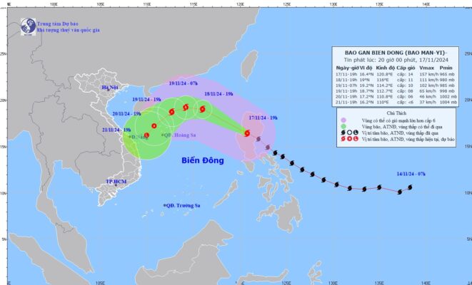 Siêu bão Manyi sắp quét qua Philippin, hướng thẳng biển Đà Nẵng – Quảng Nam. Bão sẽ giảm cấp do gặp không khí lạnh. Theo Trung tâm dự báo KTTV quốc gia, chiều tối nay (17/11), bão Manyi đã đi vào đất...